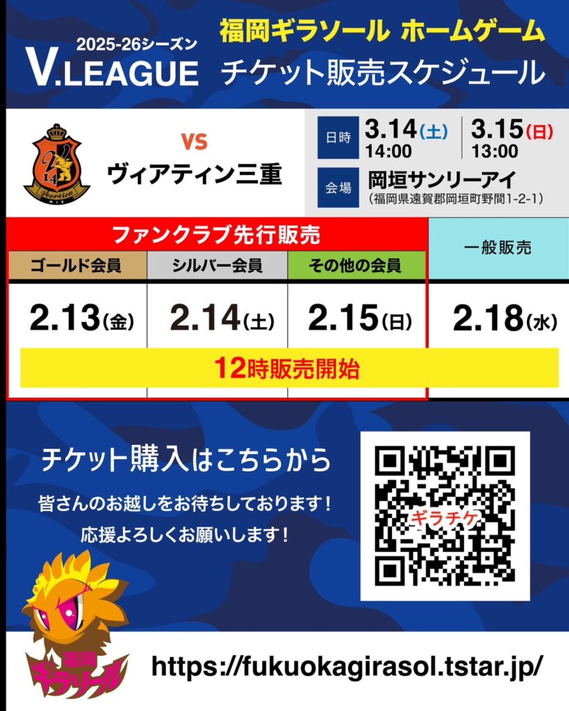 2026年3月開催のホームゲーム、対 ヴィアティン三重戦のチケット販売スケジュールのご連絡です。
