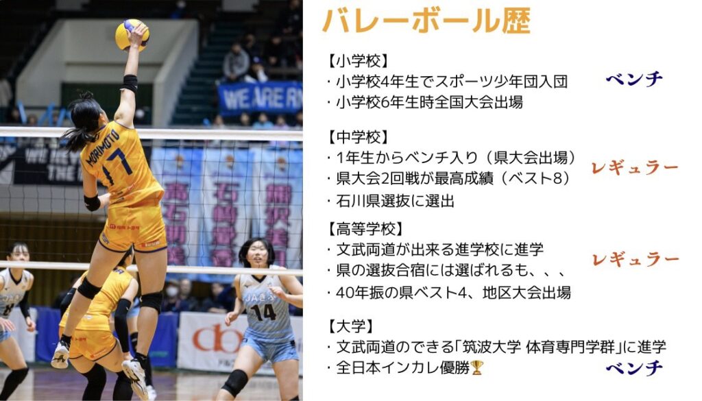 才能に限界を感じて諦めるのではなく、「好き」を原動力に努力を継続した結果、Vリーガーという夢を現実のものにしたのです。
