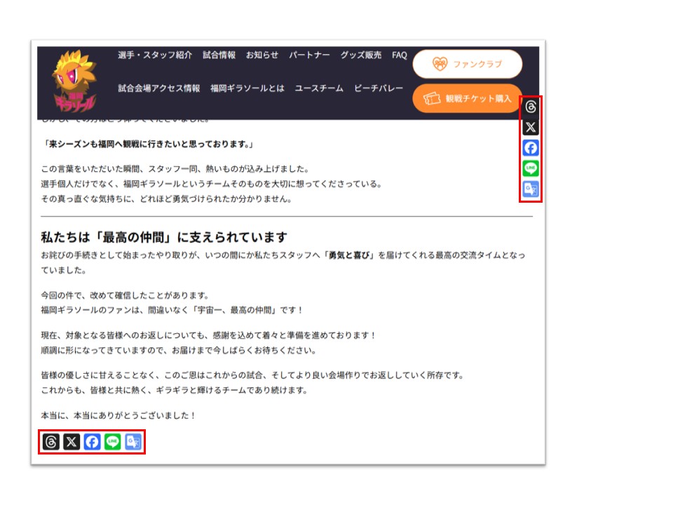 この度、福岡ギラソールの公式ホームページをより多くの方に知っていただき、ファンの皆様と一緒にチームを盛り上げていくため、各記事に「SNSシェアボタン」を設置いたしました!