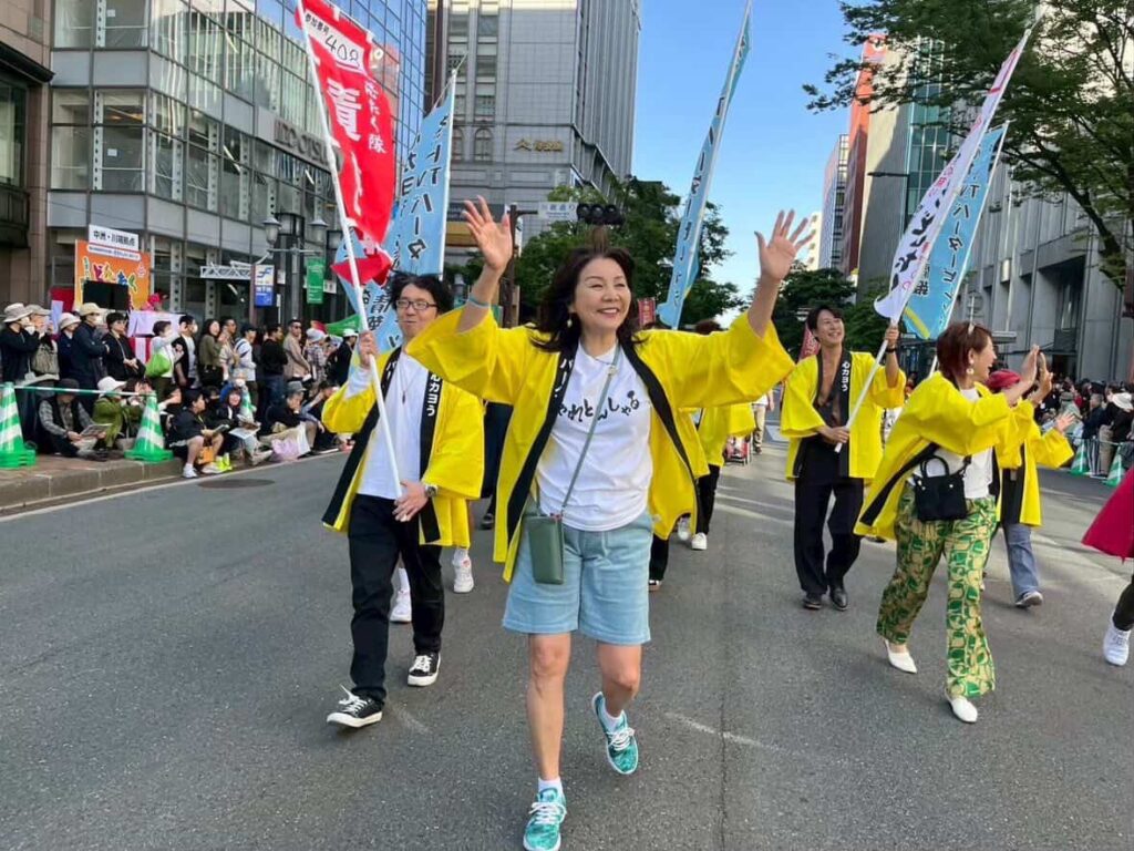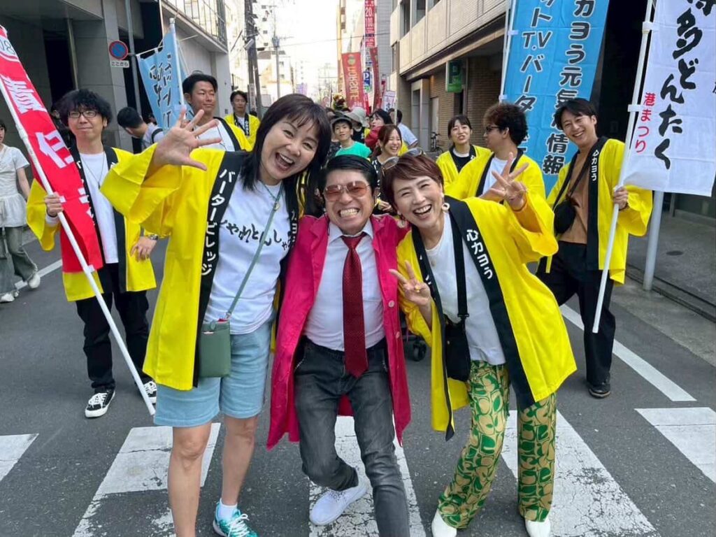 今回は、福岡の元気印・山本カヨさんが代表を務めるインターネットテレビ局「バータービレッジ」の有志による、「博多ヨカヨカ元気隊」の一員としてパレードを盛り上げます。